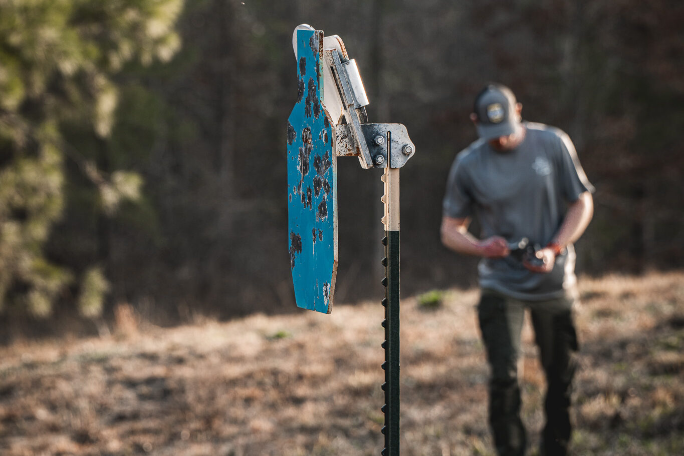 Target placement is designed to be difficult to find. Adam will be down range on comms, moving through certain loopholes while Matt directs him to place targets. Sometimes it comes down to six inches left or right to get the visibility just right. Shooters have to move across stretches of land that might be a hundred meters wide, and targets are hidden within wood lines in ways that force actual observation and terrain analysis.