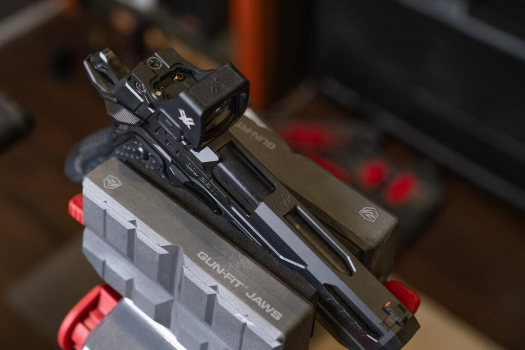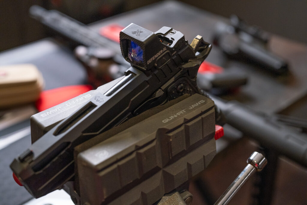 The universal clamping jaws work well for pistol optic mounting. I’ve used it for mounting red dots and, in the case of my Open Carry Optics 2311, clamping down an optic plate so I could custom-fit it with a Dremel cutting disk. The padded jaw sleeves apply enough pressure to secure the work without marring finishes.